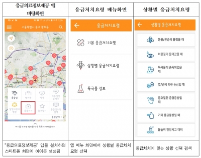 ‘응급의료정보제공’ 앱은 사용자 위치 기반으로 주변에 문을 연 병·의원과 약국을 지도로 보여주고 진료시간 및 진료과목 조회가 가능하며, 야간진료기관 정보, 자동심장충격기 위치 정보, 응급처치요령 등 유용한 내용들이 담겨 있다.