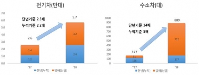 수소차도 2018년 한 해 동안에 지난 5년간 실적의 4배인 712대가 보급되어, 현재 총 889대 수소차가 운행되고 있다.