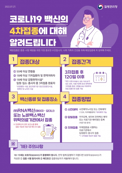 3차 접종을 완료한 50대 이상은 4개월 경과 후 접종이 가능하며 코로나19 감염력이 있어도 확진일로부터 3개월 이후부터 예방접종이 가능함을 알리며 접종을 권고하고 있다.