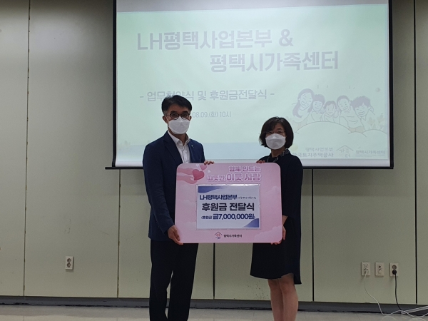 [충청뉴스큐] 평택시가족센터는 지난 9일 LH평택사업본부와 업무협약을 체결하고 후원금 전달식을 진행했다.