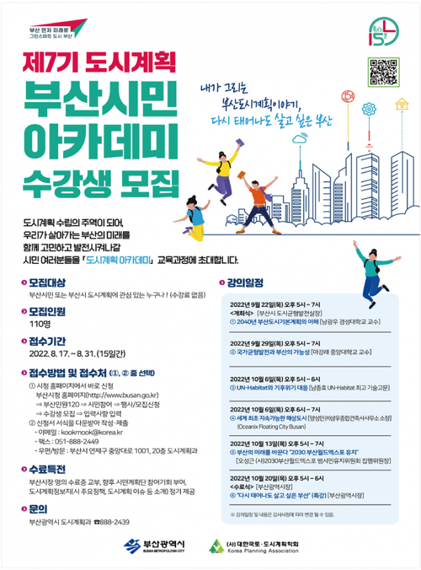 [충청뉴스큐] 부산시는 민선8기 시정의 도시비전에 대한 이해와 공감대를 확산하고 도시계획에 시민참여를 활성화하기 위해 오는 8월 17일부터 31일까지‘제7기 도시계획 부산시민 아카데미’ 수강생을 모집한다고 밝혔다.