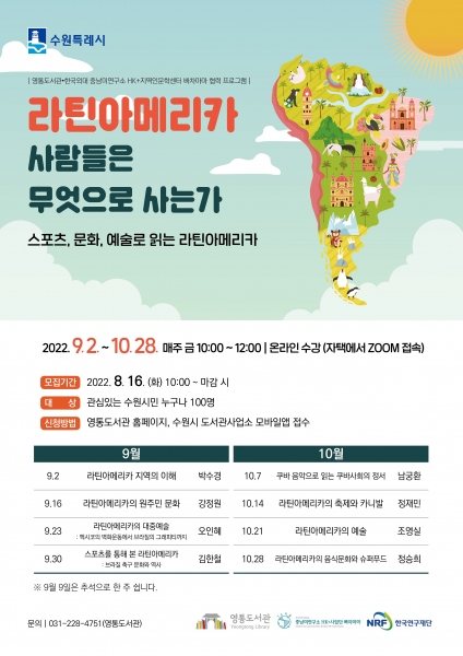 영통도서관과 한국외국어대학교 중남미연구소 HK+사업단 지역인문학센터가 협력해 진행하는 이번 강좌는 스포츠·음식·축제 등 다양하고 흥미로운 주제를 통해 라틴아메리카 지역과 문화를 알아볼 수 있는 기회를 제공한다.