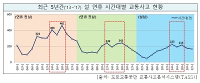 사고 현황을 시간대별로 자세히 분석해 보면 연휴 전날과 첫날은 오후 6시 전후로 가장 많이 발생했고, 설날에는 오후 2시에 가장 많았다.