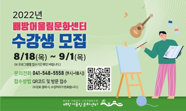 [충청뉴스큐] 아산시가 배방 원도심 도시재생사업으로 조성된 배방 어울림 문화센터에서 운영하는 ‘하반기 문화 프로그램’ 수강생을 오는 9월 1일까지 모집한다.