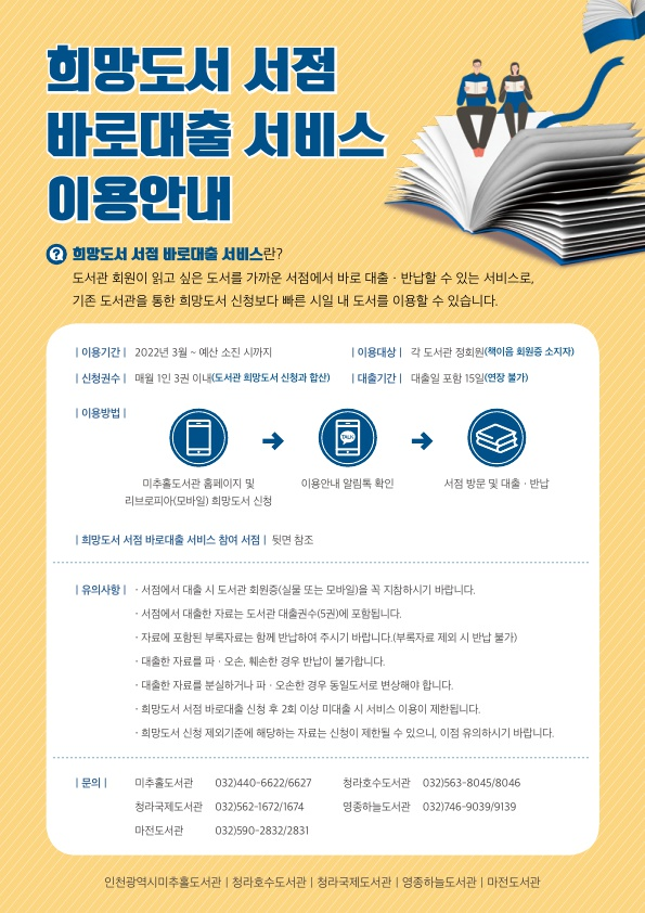 [충청뉴스큐] 인천광역시는 미추홀도서관 및 분관에서 시민이 원하는 책을 서점에서 바로 빌려볼 수 있는‘희망도서 서점 바로대출’서비스를 운영 중이라고 밝혔다.