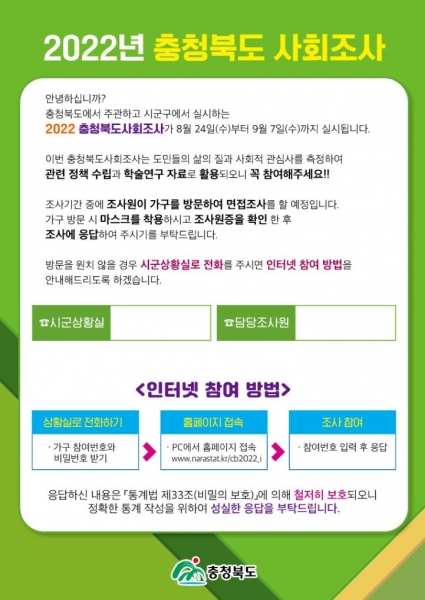 [충청뉴스큐] 음성군은 24일부터 다음 달 7일까지 15일간 군에서 표본으로 선정된 960가구의 만 13세 이상 가구주와 가구원을 대상으로 ‘2022년 충청북도 사회조사’를 시행한다.
