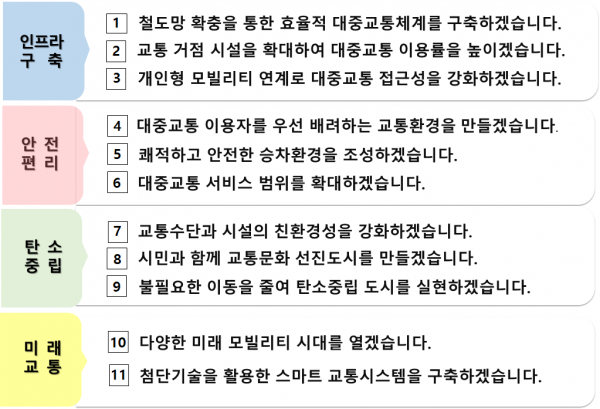 시내버스 대·폐차 시 전기·수소버스를 우선적으로 구입해 친환경차량 비율을 80% 이상으로 끌어올리고 도심형 친환경 교통수단인 트램을 도시철도망 구축계획 노선 외에도 부산에 적합한 다양한 노선을 지속적으로 발굴해 대중교통 소외지역을 최소화한다.