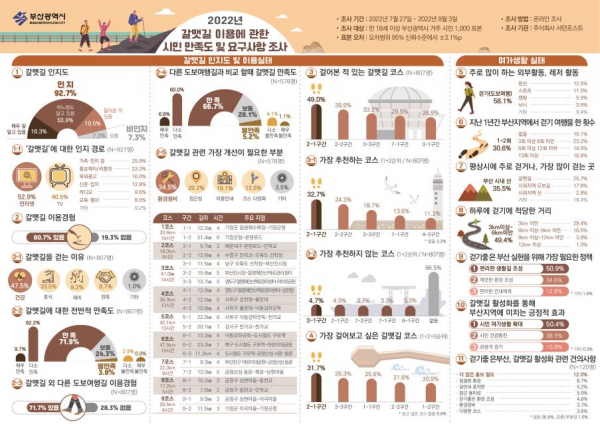 조사결과, 갈맷길에 대한 인지도 92.7% 걸어본 경험 80.7% 만족도 71.9%로 대부분의 부산시민은 갈맷길을 알고 걸어본 적이 있는 것으로 나타났고 전반적인 만족도 높은 것으로 나타났다.