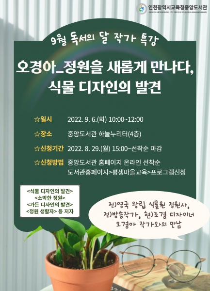 [충청뉴스큐] 인천광역시교육청중앙도서관은 9월 6일 작가 특강 ‘오경아_정원을 새롭게 만나다.