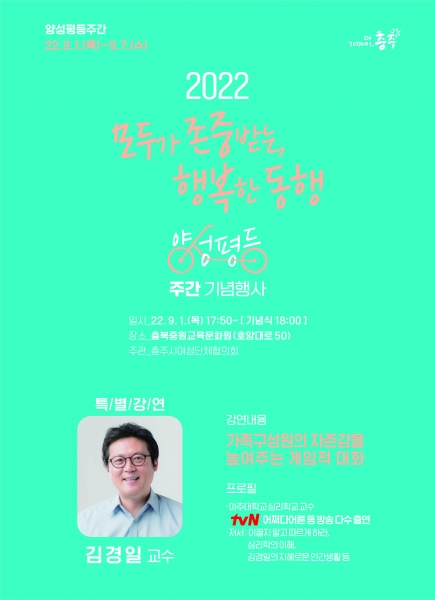 시는 9월 1일 오후 4시 성내동 문화창업재생허브에서 개최되는 양성평등문화제를 시작으로 양성평등주간 기념식을 개최하고 이어 ‘어쩌다 어른’, ‘세바시’등의 방송 프로그램을 통해 잘 알려진 아주대학교 김경일 교수를 초청해 ‘가족구성원의 자존감을 높여주는 게임적 대화’라는 주제의 강연을 진행한다.