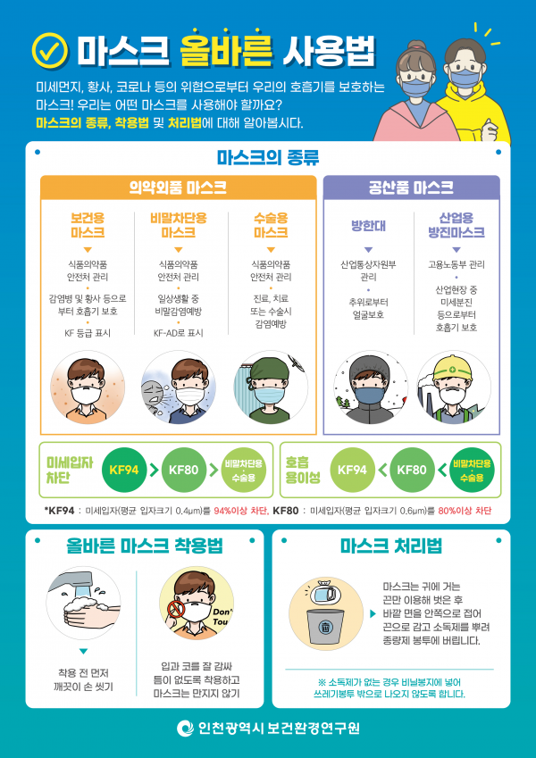 [충청뉴스큐] 인천광역시는 올바른 마스크 선택 및 사용에 도움을 줄 수 있는 정보를 인천보건환경연구원 누리집 공지사항에 게시해 시민들에게 제공한다고 밝혔다.