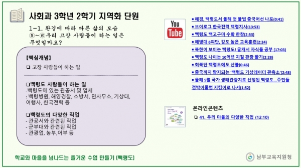 ‘3학년 2학기 사회과 지역화 단원 수업도움자료’는 미추홀구, 중구·영종도, 동구·옹진군 등 자치구별로 소주제별 카드뉴스 형태로 제작됐으며 지역화 단원 수업을 위한 동영상과 활동지 그리고 참고 사이트 등이 담겼다.