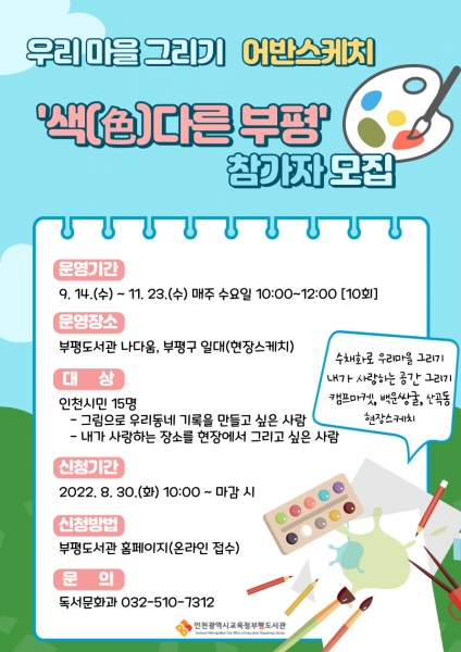 [충청뉴스큐] 인천광역시교육청부평도서관에서는 마을의 모습을 그림으로 기록해 지역 자료로 구축하는 마을 아카이빙 사업 ‘색다른 부평’을 9월 14일부터 11월 23일까지 총 10회차 운영한다.