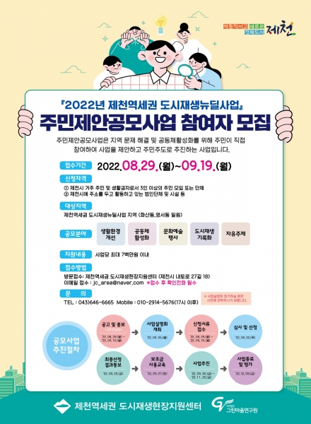 [충청뉴스큐] 제천역세권 도시재생현장지원센터는 주민 주도로 마을공동체 회복과 지속가능한 도시재생사업 기반을 마련하기 위해 ‘제천역세권 도시재생뉴딜 주민제안공모사업’을 추진한다.