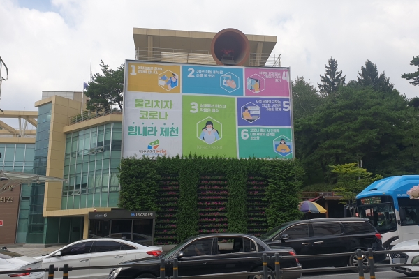 보건소에서는 홍보효과의 극대화를 이루기 위해 주요 일상방역 수칙이 적혀있는 대형 현수막을 8월 말부터 유동인구가 많은 제천시 시민회관 벽면에 게첩했다.