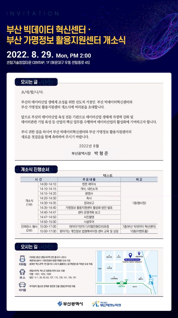 시는 ‘부산 빅데이터혁신센터’ 설립과 ‘부산 가명정보 활용 지원센터’ 유치를 통해 데이터 산업 거점의 초석을 마련하고 향후 ‘가명정보 결합전문기관’ 지정을 통해 ‘빅데이터혁신센터’를 데이터 융복합 전문기관으로 발전시키고자 한다.