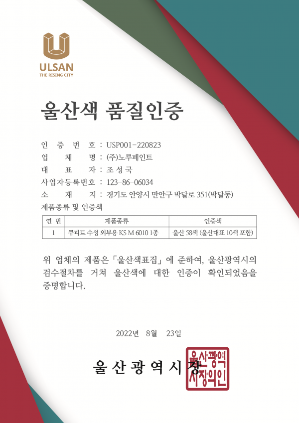 울산시는 ㈜노루페인트사가 신청한 ‘수성 페인트 울산 58색’에 대해 한국색채디자인개발원의 검수를 거쳐 ‘울산색 품질 인증서’를 교부했다고 밝혔다.