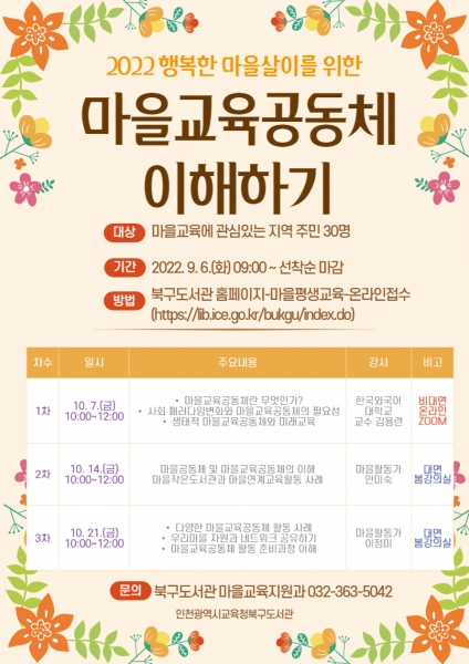 [충청뉴스큐] 인천광역시교육청북구도서관은 10월 7일부터 21일까지 매주 금요일 행복한 마을살이를 주제로 ‘2022 마을교육공동체 이해하기’ 연수를 운영한다.
