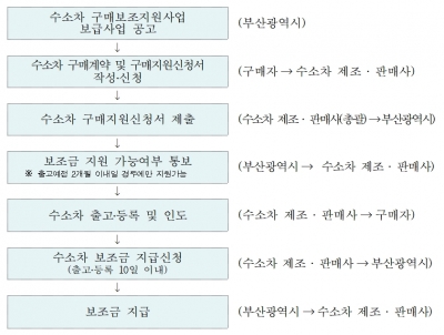 수소차 구매지원 신청방법은 지정 제조·판매사를 방문해 구매지원신청서를 작성하면, 제조·판매사에서는 구매자를 대행해 신청서 및 증빙서류를 부산시에 제출하고, 시에서는 결격여부 확인 후 지원 가능여부를 제작사로 통보한다.