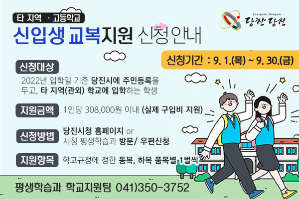 [충청뉴스큐] 당진시는 지난해에 이어 올해도 타지역 중·고등학교에 입학하는 당진시 학생에게 1인당 308,000원 한도 내에서 교복 구입비를 지원한다고 밝혔다.