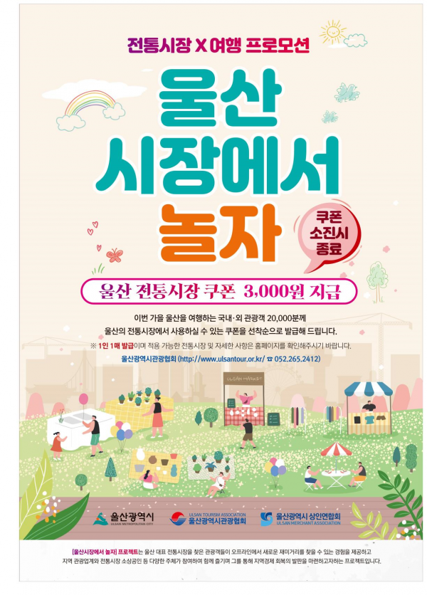 쿠폰은 9월 6일부터 전통시장 방문을 포함하는 울산여행상품 이용 단체 관광객과 관내 숙박업체를 이용하는 개별 관광객 등 2만명에게 3,000원 권을 선착순 배부한다.