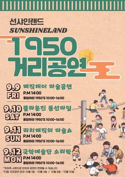 [충청뉴스큐] 논산문화관광재단은 추석연휴 고향을 방문하는 귀성객 및 방문객들을 위해 오는 9일부터 12일까지 선샤인랜드 1950스튜디오에서 거리공연을 개최한다.