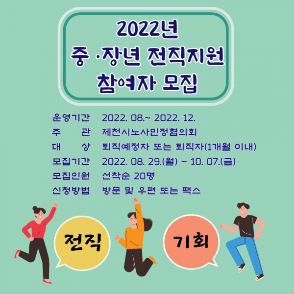 중·장년 전직지원사업은 만 40세 이상 중·장년 퇴직자를 대상으로 생애경력설계 및 전직·재취업 지원서비스, 전직스쿨프로그램 등과 함께, 노사발전재단 중장년일자리희망센터 및 제천시일자리종합지원센터와 협업해 전직을 희망하는 참여자에게 구직전략 등 취업지원서비스를 제공하게 된다.