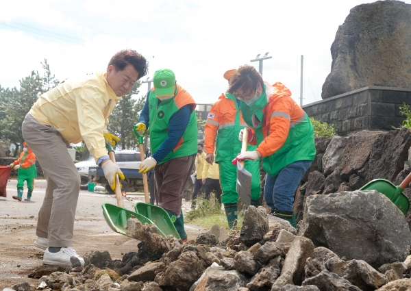 오영훈 지사는 서귀포시 자율방재단 및 대정읍 주민들과 함께 태풍피해 복구 작업에 동참했다.