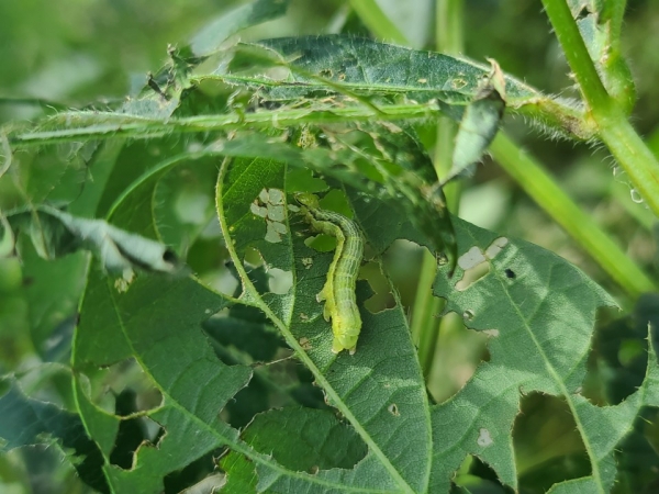 ‘콩은무늬밤나방’은 3령 유충까지는 잎에 작은 구멍을 만들지만, 그 이후 령기부터는 왕성한 식욕으로 매일 체중의 3배에 달하는 잎 조직을 섭식한다.