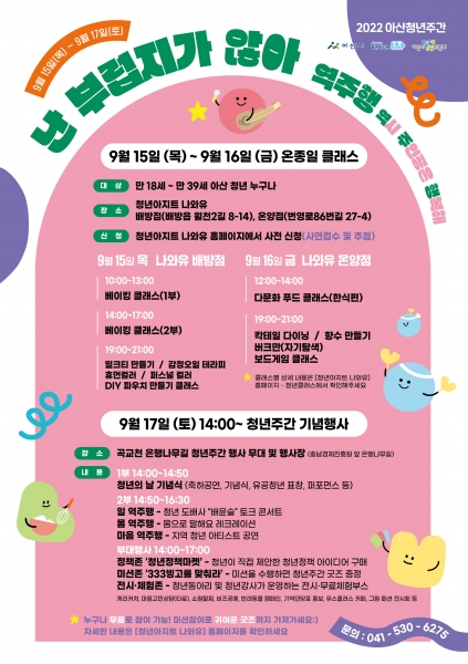 [충청뉴스큐] 아산시가 ‘청년의 날’을 맞이해 오는 15일부터 17일까지 3일간 청년아지트 나와유와 곡교천 은행나무길에서 ‘2022 아산청년주간’ 행사를 개최한다.