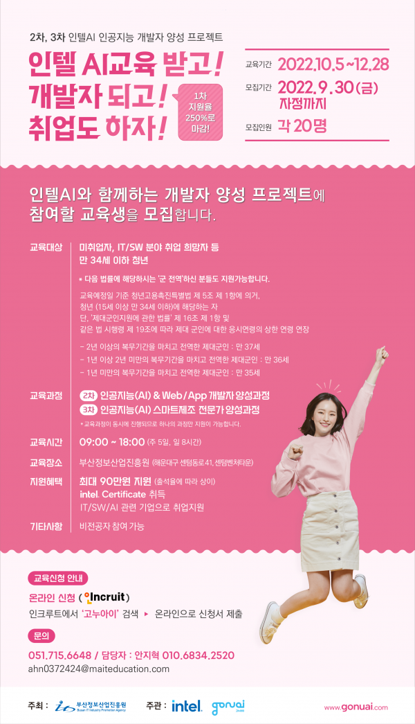 [충청뉴스큐] 부산시가 글로벌 IT기업 인텔의 인공지능 교육 커리큘럼을 활용한 ‘인공지능 개발자 인력양성 프로그램’의 교육생을 9월 30일까지 모집한다고 밝혔다.