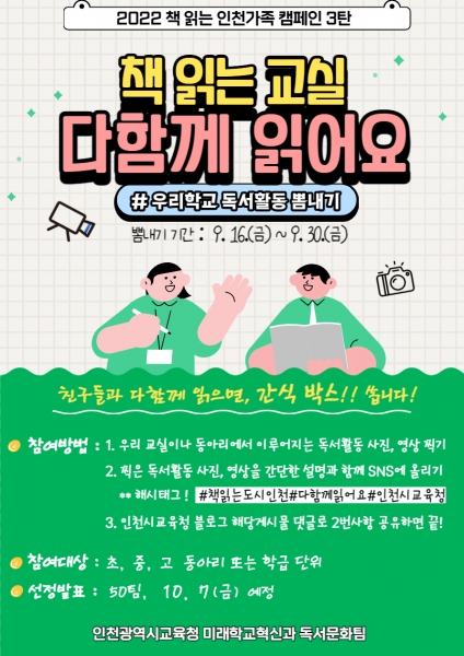 [충청뉴스큐] 인천광역시교육청은 책 읽는 학교문화 조성을 위해 초·중·고 동아리나 학급단위를 대상으로 ‘책 읽는 교실× 다함께 읽어요’를 16일부터 30일까지 운영한다.