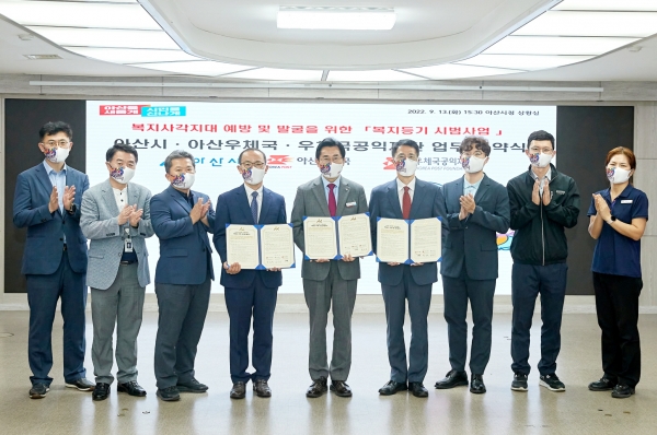 [충청뉴스큐] 아산시가 지난 13일 시청 상황실에서 아산우체국, 우체국공익재단과 함께 복지 사각지대 예방 및 발굴을 위한 ‘복지등기 시범사업’ 업무 협약식을 진행했다.