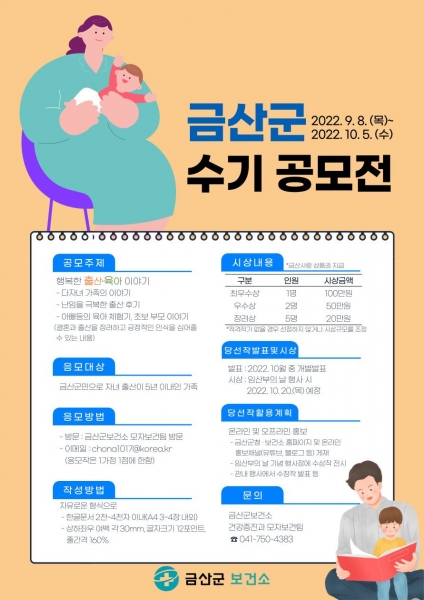 공모 접수는 금산군보건소 홈페이지 공고문을 참고해 10월 5일까지 참가신청서와 수기 작품 파일을 금산군보건소 모자보건팀에 방문 또는 이메일로 제출하면 된다.