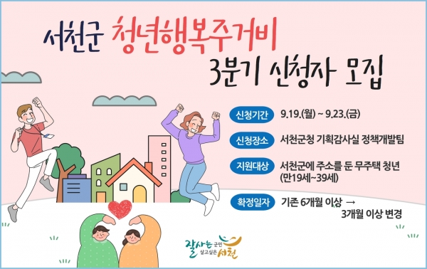 [충청뉴스큐] 서천군이 청년의 주거 부담을 덜기 위한 청년 행복 주거비 3분기 신청을 오는 19일부터 23일까지 받는다.