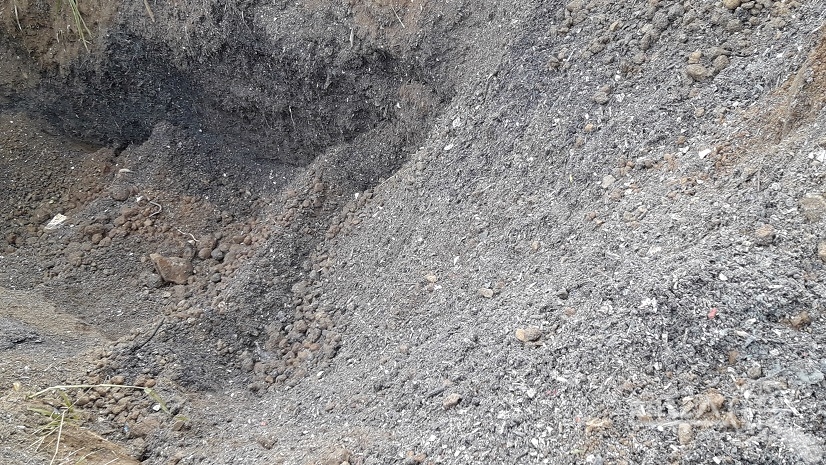 굴착기로 1미터 정도부터 파들어가자 , 까맣게 보이는 흙은 분쇄후 소각한 폐프라스틱 조각과 냄새가 나는 것으로 보아 산업 폐기물로 의심된다.