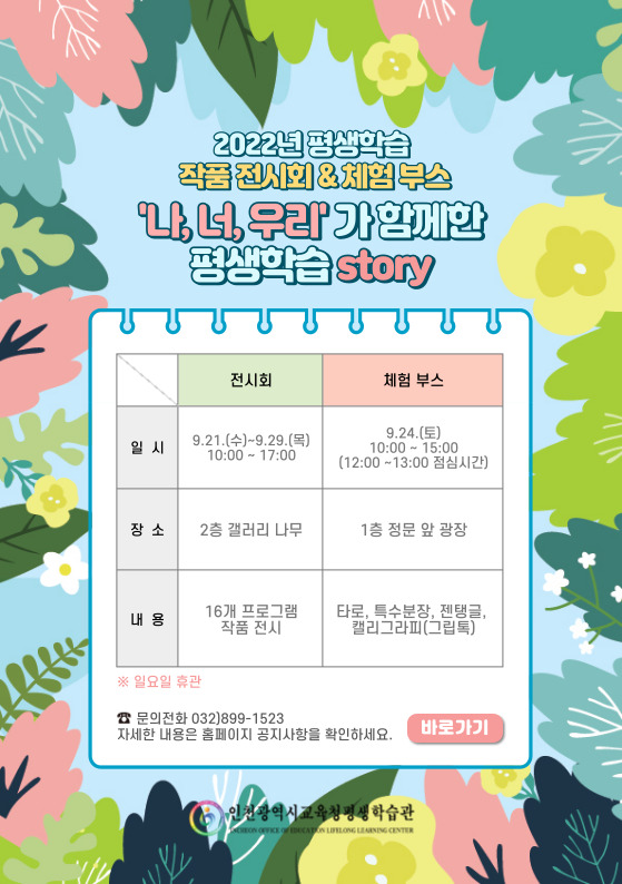 [충청뉴스큐] 인천광역시교육청평생학습관에서는 ‘나, 너, 우리가 함께한 평생학습 Story’라는 주제로 21일부터 29일까지 평생학습 작품 전시회를 개최한다.