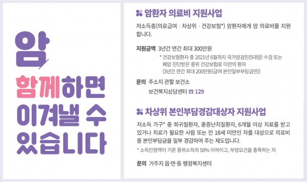 단, 2021년 7월부터 의료비지원사업 개편에 따라 일반 건강보험 가입자는 신규 지원이 중단됐으나 예외적으로 2021년 6월 30일까지 국가암검진 수검 후 만 2년 이내 5대 암을 진단을 받은 경우 또는 2021년 6월 30일까지 폐암을 진단받은 경우에는 건강보험료 기준 충족 시 급여 본인부담금에 한해 연간 최대 200만원까지 지원이 가능하다.
