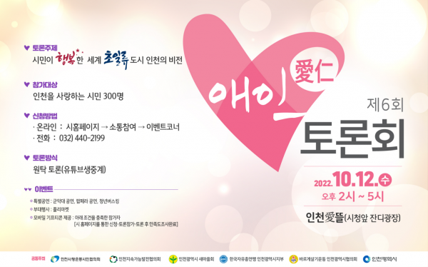 [충청뉴스큐] 인천광역시는 민선8기 출범 100일을 맞아 시민과 직접 소통하고 시민과 함께 시 발전 방향을 모색하는 ‘애인토론회’를 10월 12일 인천애뜰에서 개최한다고 밝혔다.