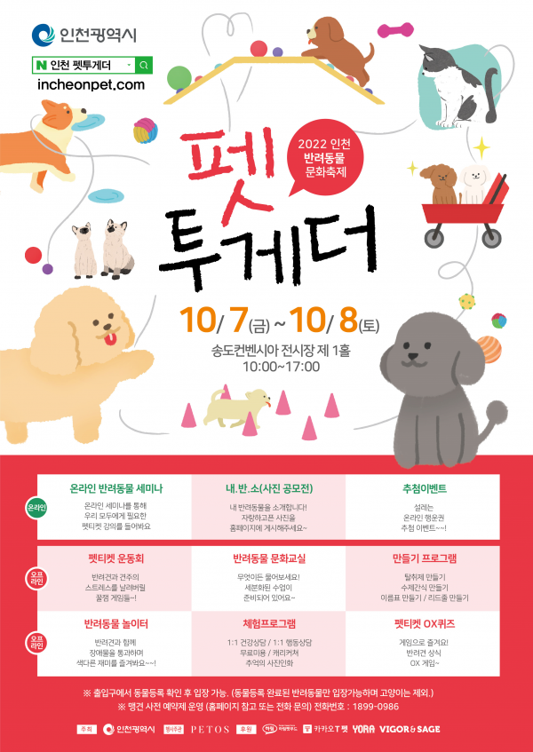 [충청뉴스큐] 인천광역시는 오는 10월 7일과 8일 양일간 송도 컨벤시아 제1홀에서 ‘펫 투게더 - 2022 인천 반려동물 문화축제’를 개최 한다고 밝혔다.
