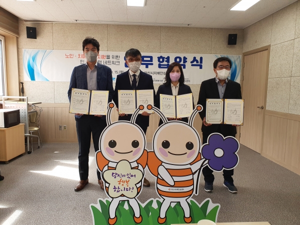 [충청뉴스큐] 아산시치매안심센터는 15일 아산시노인종합복지관, 아산종합사회복지관, 온양노인복지센터와 노인·치매 통합지원을 위한 민·관 협력 네트워크 구축을 위해 업무협약을 체결했다.