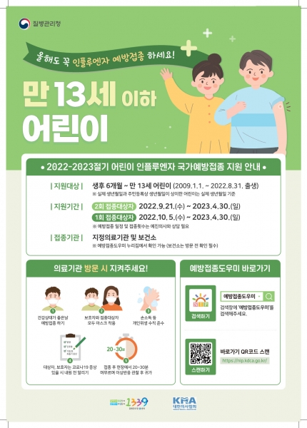[충청뉴스큐] 청주시 보건소는 가을, 겨울철 인플루엔자와 코로나19 동시 유행을 대비해 오는 21일부터 인플루엔자 2회 접종 대상 어린이를 시작으로 ‘2022-2023절기 인플루엔자 무료 예방접종 사업’을 순차적으로 실시한다.