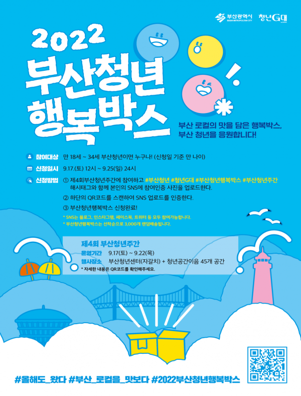 [충청뉴스큐] 부산시가 오는 9월 17일부터 9월 25일까지 ‘제4회 부산청년주간’에 참여한 청년을 대상으로 ‘청년행복박스’를 전달하기 위해 신청을 받는다고 밝혔다.