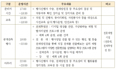 행사는 별도 예약 없이 당일에 참여하면 되고, 천체망원경을 통해 직접 천체를 관측해보는 천체관측 활동은 운영시간 중에는 언제라도 참여할 수 있고 영상물 관람과 별자리 설명은 오후 7시 20분부터 40분간 총 4회에 걸쳐 진행되며 생활천문학 강의는 오후 7시 30분부터 20분간 총 4회 진행된다.