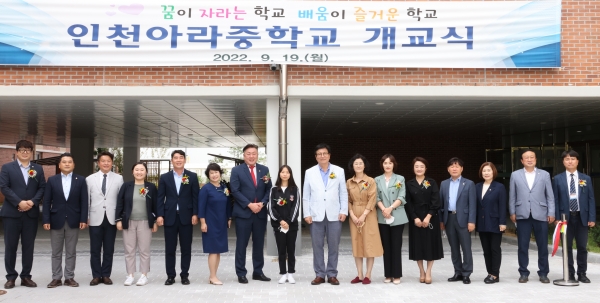 [충청뉴스큐] 인천광역시의회 교육위원회는 올해 3월 문을 열고 19일 개교식을 가진 인천아라중학교를 찾아 개교를 축하했다.