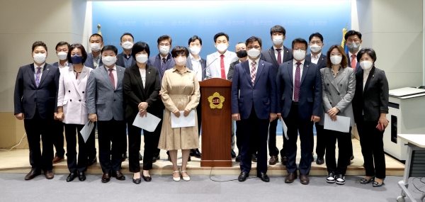 [충청뉴스큐] 경기도의회 국민의힘 소속 의원들이 20일 경기도의회 3층 브리핑룸에서 경기도교육청과 경기도의회 모든 의원들을 대상으로 도내 6개 통합교육지원청 분리·설치를 위한 공동대응을 촉구하는 성명을 발표했다.