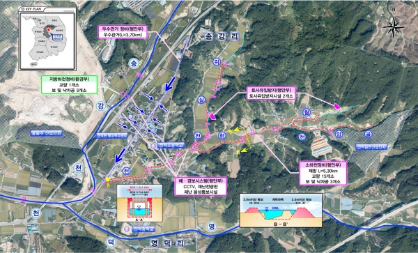 5년간 총사업비 287억원을 투입해 진행할 주요 개선 내용은 소하천 5.3㎞, 세천 1.0㎞, 교량 재가설 16개소, 보/낙차공 6개소와 면 소재지 우수관로 3.7㎞ 정비, 토사유출 방지 시설 2개소와 홍수 예·경보시설 1개소 설치 등이다.