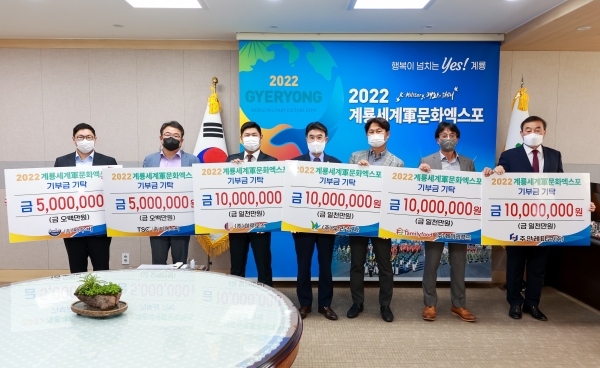 기부금을 전달한 기업체 대표들은 “계룡시에서 기업을 경영하면서 지역발전에 조금이라도 도움이 될 수 있는 일을 할 수 있어서 매우 기쁘게 생각한다”며 “계룡시 개청이래 최대규모 국제행사로 개최되는 軍문화엑스포 성공 개최를 염원하며 거래처 등을 대상으로 홍보도우미 역할도 열심히 하겠다”고 말했다.