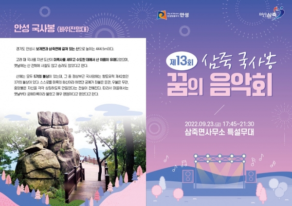 [충청뉴스큐] 안성시 삼죽면 주민자치위원회는 ‘제13회 삼죽 국사봉 꿈의 음악회’가 오는 9월 23일 삼죽면사무소 특설무대에서 개최된다고 밝혔다.