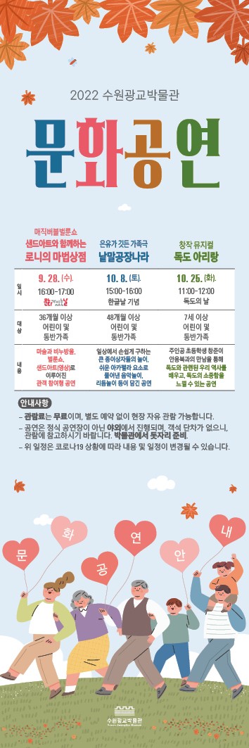 수원광교박물관 관계자는 “코로나19로 인해 중단됐던 ‘문화가 있는 날에 만나는 수원광교박물관’ 대면 공연이 3년 만에 다시 돌아왔다”며 “어린이들이 즐길 수 있는 콘텐츠를 준비했다”고 말했다.